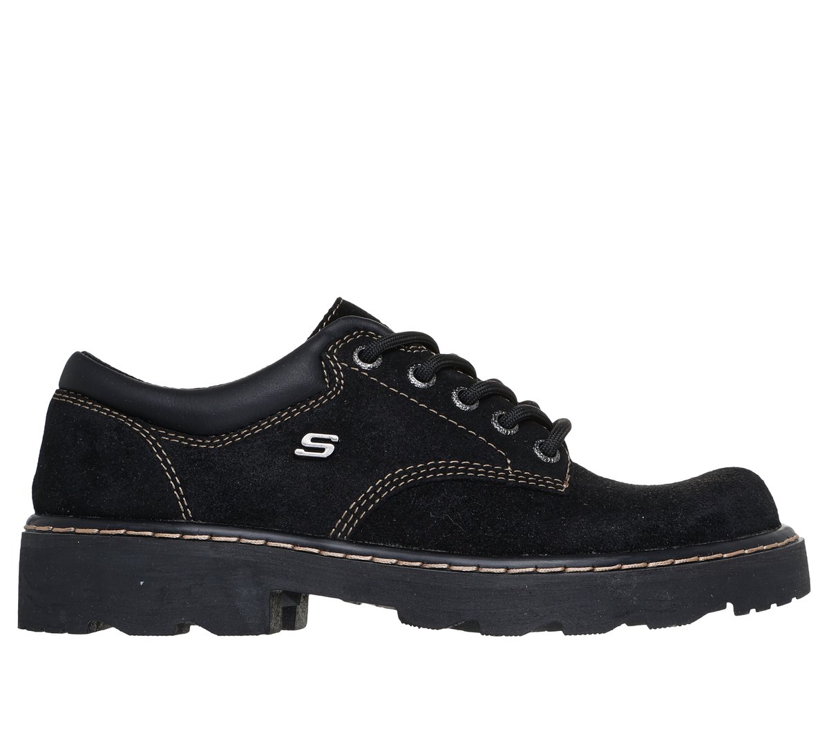 Look stylishly tough in the SKECHERS Parties-Mate oxford. Scuff resistant leather in a casual lace up oxford with plain toe. Stitching and overlay detail.