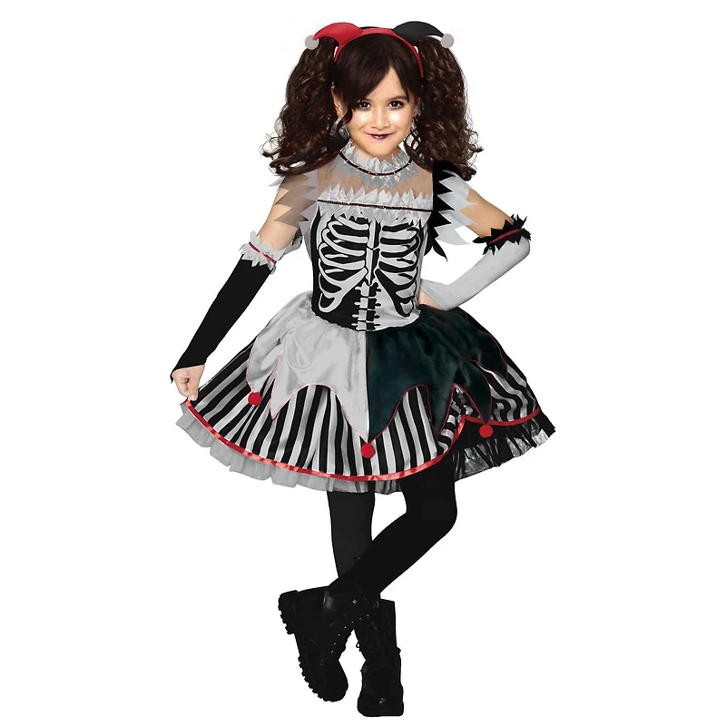 Rock a spookier kind of creepy in this Skelequeen costume as you plan your next trick at the Halloween party and you will surely be keeping everyone on their toes . This spooky costume features a skeleton printed rib cage and stripe printed skirt with a two color jagged peplum and red pom pom, red satin jagged neckline and collar details. Perfectly matched with two color long glovelettes and a pom pom headband. Complete the outfit with a two color pair of tights.