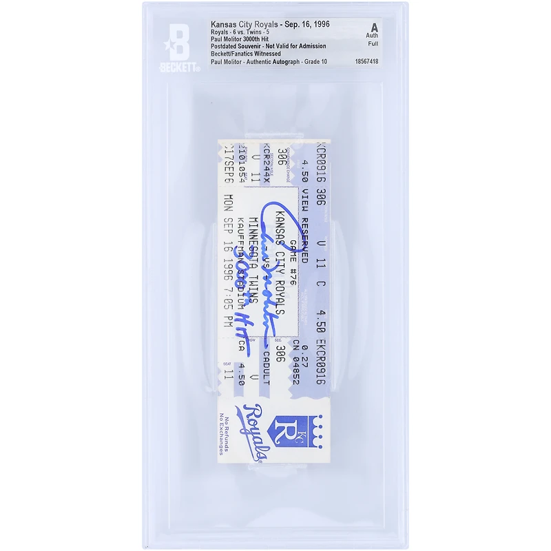 This Paul Molitor autographed Career Hit 3,000 Souvenir Beckett Fanatics Witnessed Authenticated Auto 10 Ticket from September 16, 1996 with "3000 Hit" Inscription is ready to help you display your MLB fandom. Encapsulated in a tamper-proof sleeve for preservation, this striking ticket highlights an important milestone in the Minnesota Twins legend's career to make it the ultimate collector's item.