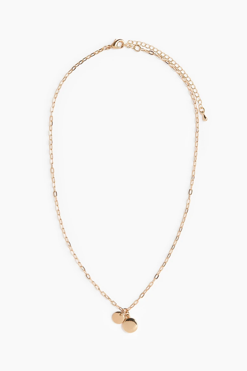 Paperclip chain necklace in metal with two disc pendants. Adjustable length with trigger clasp.