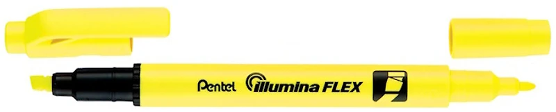 'Recycology' - Made with over 50% recycled materials. Illumina Flex highlighter, dual tip: bullet and chisel. On one side, there is a fine bullet tip. On the other side, the chisel tip features a ring ditch design in order to be flexible. This allows for consistent line widths and more control over your strokes. Great combination for highlighting, underlining and color coding. Suitable for papers, fax and copies. Ideal in the office, home or classroom.