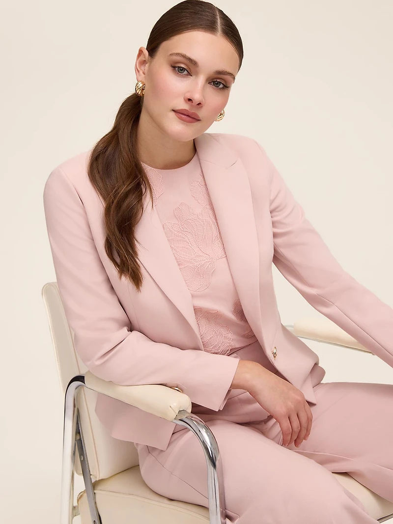 Elevate your tailored look with this short peplum blazer, designed in a soft pink hue for a refined yet feminine statement. The structured silhouette is balanced with a subtle peplum hem that defines the waist, while classic lapels and a single-button closure keep the finish polished. Perfect for work or special occasions, this blazer pairs seamlessly with the matching pant for a modern, coordinated set or styles just as effortlessly with skirts and denim. Complete the look and wear it your way.