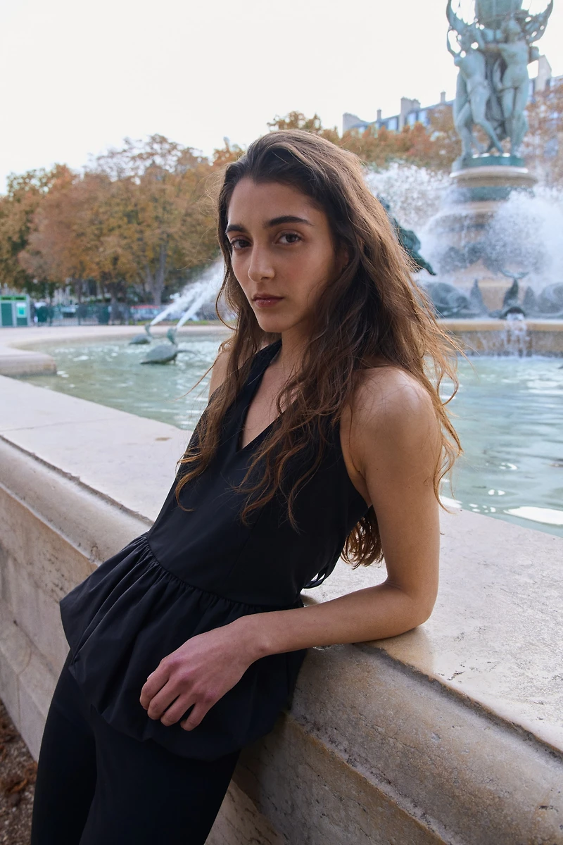 Short, fitted top in thick jersey. Wide halterneck ties, V-neck, and a bubble hem for a flared peplum.