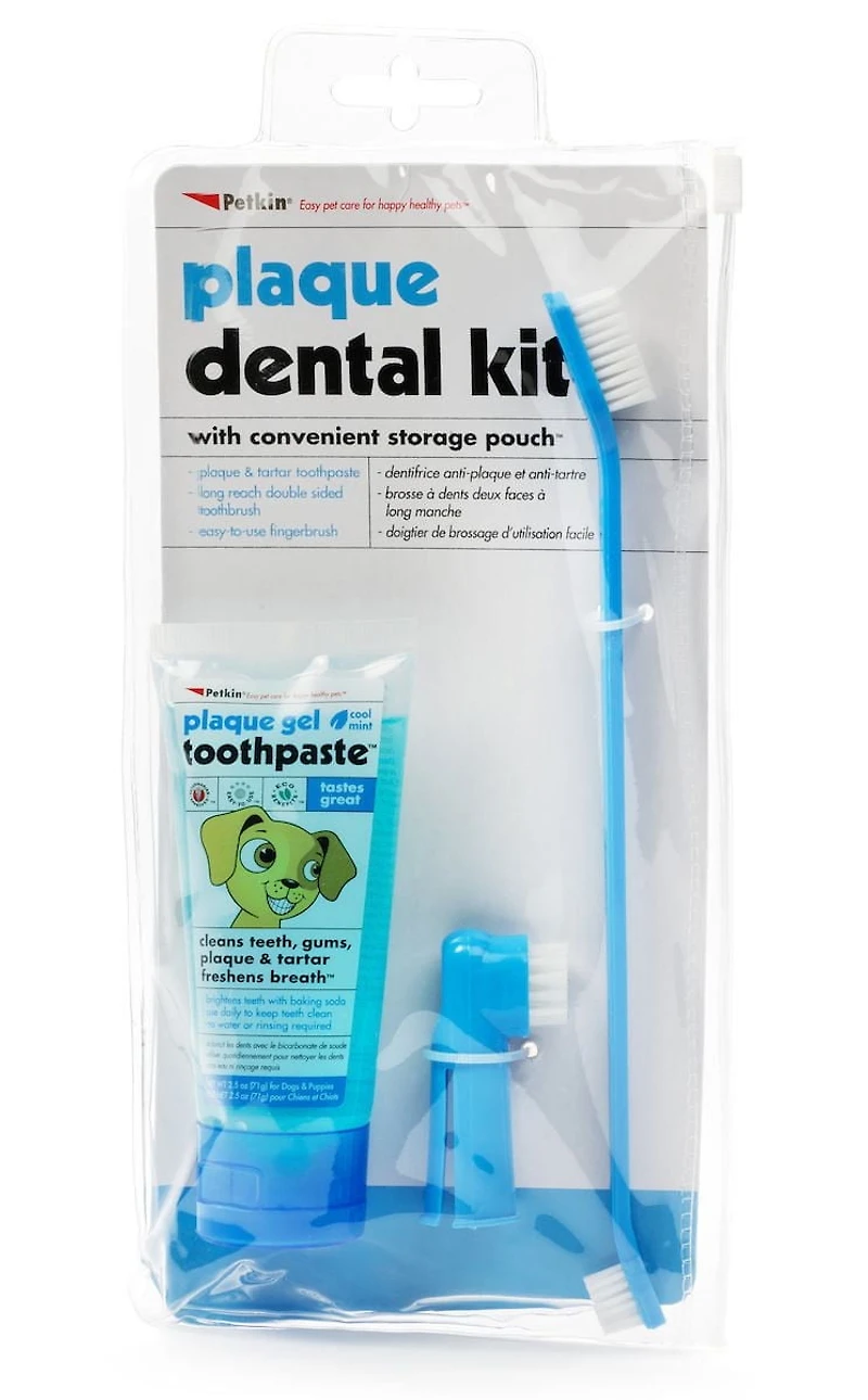Plaque Dental Kit provides an easy way to clean teeth, gums, plaque and tartar while freshening your pet’s breath. Brightens teeth with baking soda. Includes plaque gel toothpaste, toothbrush and finger toothbrush in a handy storage pouch