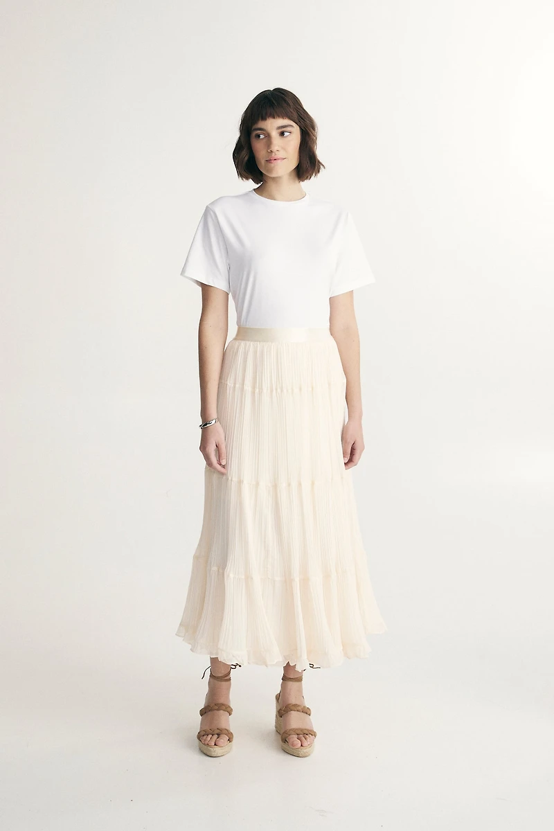 Indulge in refined elegance with this pleated mesh skirt. Crafted for versatile styling, it pairs beautifully with both tailored pieces and relaxed tops. Ideal for occasions requiring sophistication and ease.