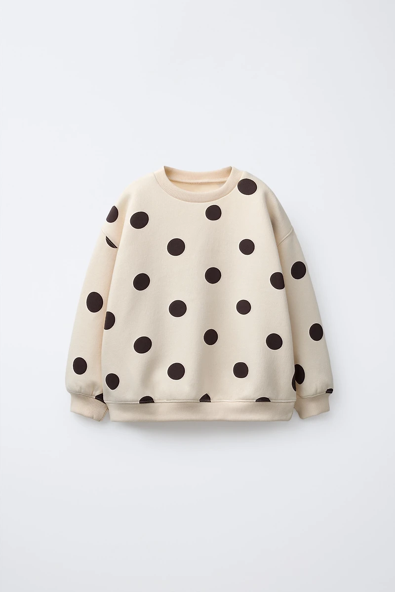 Sweatshirt with round neck and long sleeves. Ribbed trim. Polka dot print and label appliqué on the back.