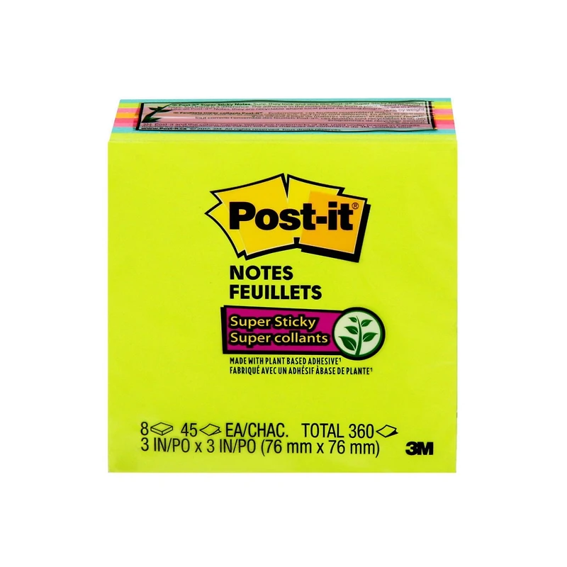 No matter where your next great idea happens to strike, Post-it® Super Sticky Notes adhere to practically any surface, sticking securely, and removing cleanly! Available in an assortment of bold, bright colours to keep you organized.From reminders to memos, Post-it® Super Sticky Notes are an excellent organizational tool that helps you stay ahead of your busy schedule. The extra-strong adhesive used in these notes means that they are a no-nonsense, high-performance option that you can trust. Add Post-it® Super Sticky Notes to your desk or kitchen drawer today and get organized.