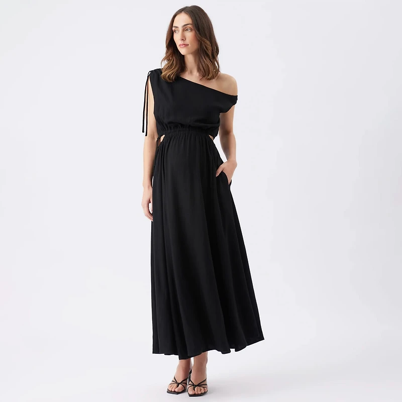 The Presley Off Shoulder Dress is all about effortless style and comfort. Made from a soft viscose-linen blend, it features an asymmetric neckline with adjustable ties at the shoulders and waist so you can style it your way. The elastic waist creates a flattering shape, while playful side cutouts add a modern edge. Side seam pockets bring a relaxed feel to this elevated, event-ready dress.