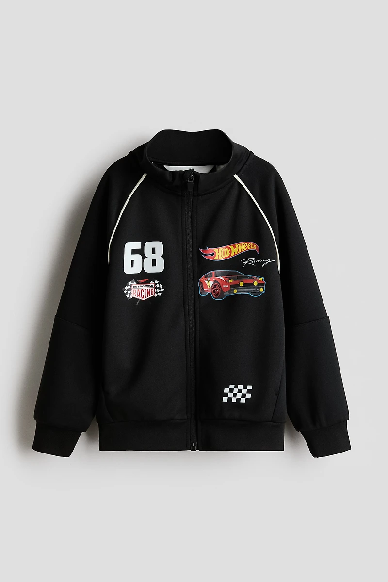 Jacket in thick jersey with a slight sheen, printed motif, and brushed inside. Stand-up collar, zipper at front with anti-chafe chin guard, long raglan sleeves, and discreet side pockets. Ribbing at cuffs and hem.