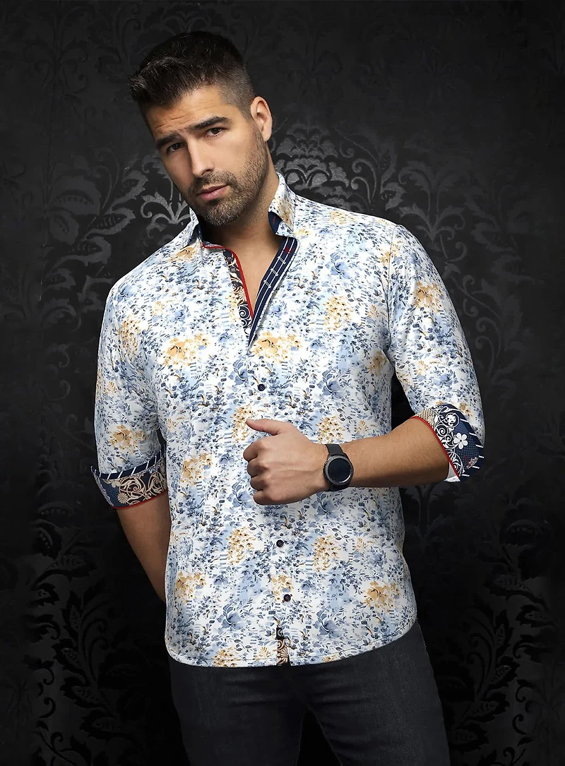 DESCRIPTION- Semi-slim fit- Sport shirt- Stretch fabric- Sateen cotton- Semi-spread collar- Printed trim inside neckband- Trimmed inner plaquet- Print trim inside cuffs- No pocket