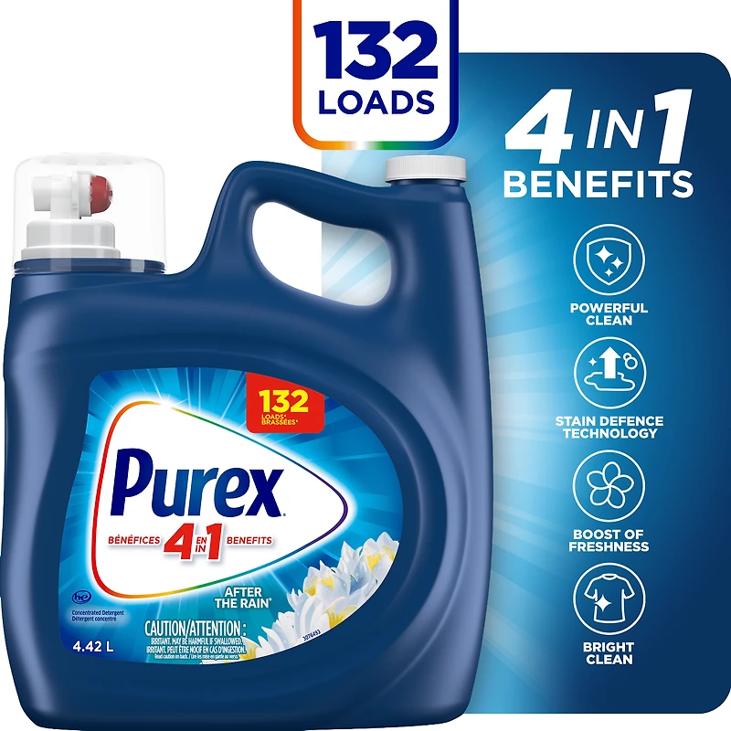 Purex After the Rain Liquid Laundry Detergent delivers an extraordinary clean and invigorating fresh scent, now in a more concentrated dose! It’s ideal for everyday use and can be found at an affordable price. Purex laundry detergent with 4-in-1 benefits offers a powerful clean and stain defence technology. This liquid detergent delivers a bright clean and a boost of freshness to your clothes. It is suitable for all types of washing machines, including HE (High-Efficiency). Discover a powerful clean at an affordalbe price with Purex, Canada’s #1 Selling Value Brand.
