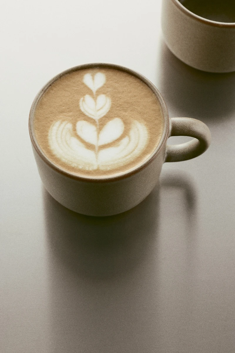 Mug in stoneware. Reactive glaze creates variegated coloring, giving each piece a unique appearance. Unglazed base for a contrasting color and naturally textured finish.