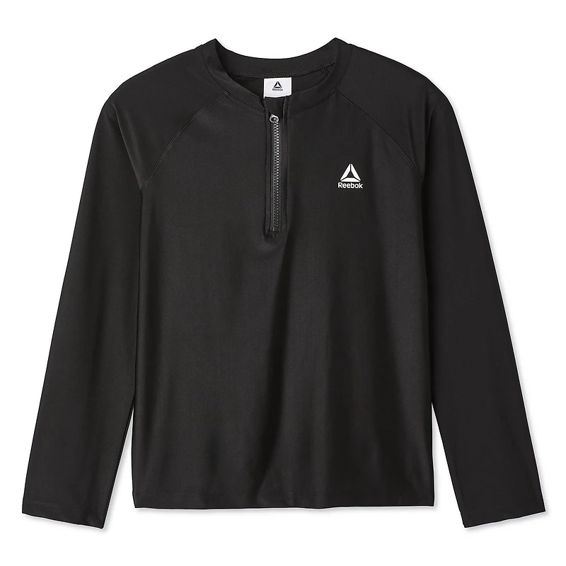 Reebok boys’ long-sleeve rashguard is built for days in the water and under the sun. Made of quick-dry fabric that’s resistant to chlorine pool water and sea water, this rashguard offers UPF 50 protection to help shield against harsh rays. This rashguard is designed with a crew neck, long raglan sleeves, a quarter-zip closure for easy on and off, and a rubberized logo graphic at the chest. It pairs easily with swim trunks or board shorts for beach and pool days.