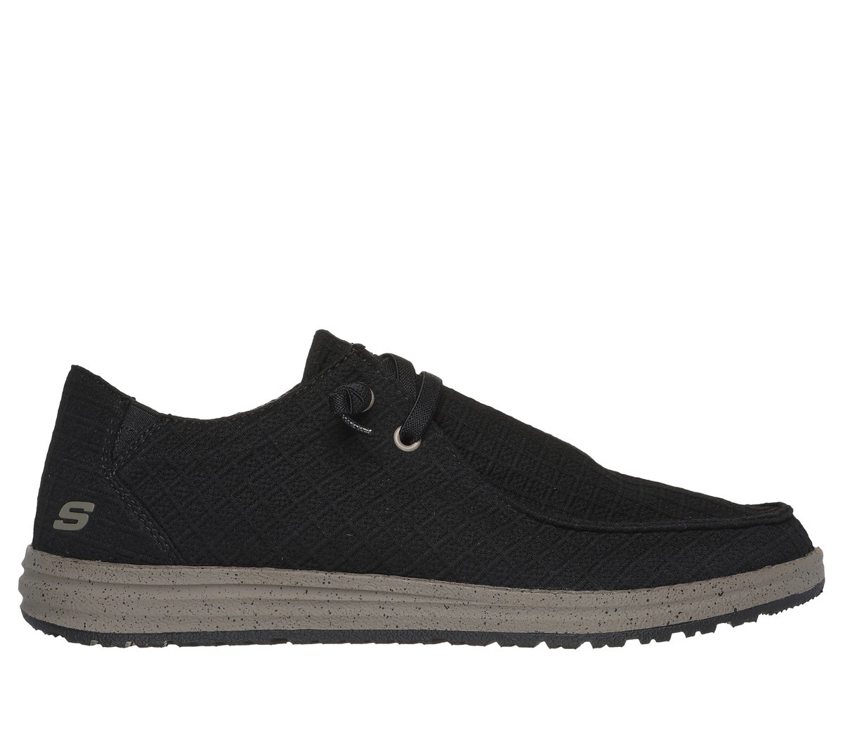 Great comfort pairs well with laid-back style in the Skechers Relaxed Fit®: Melson - Quinland. This vegan design features a woven upper with stretch laces, Skechers Air-Cooled Memory Foam® comfort insole and Skechers Goga Mat Arch™ cushioning for added support.