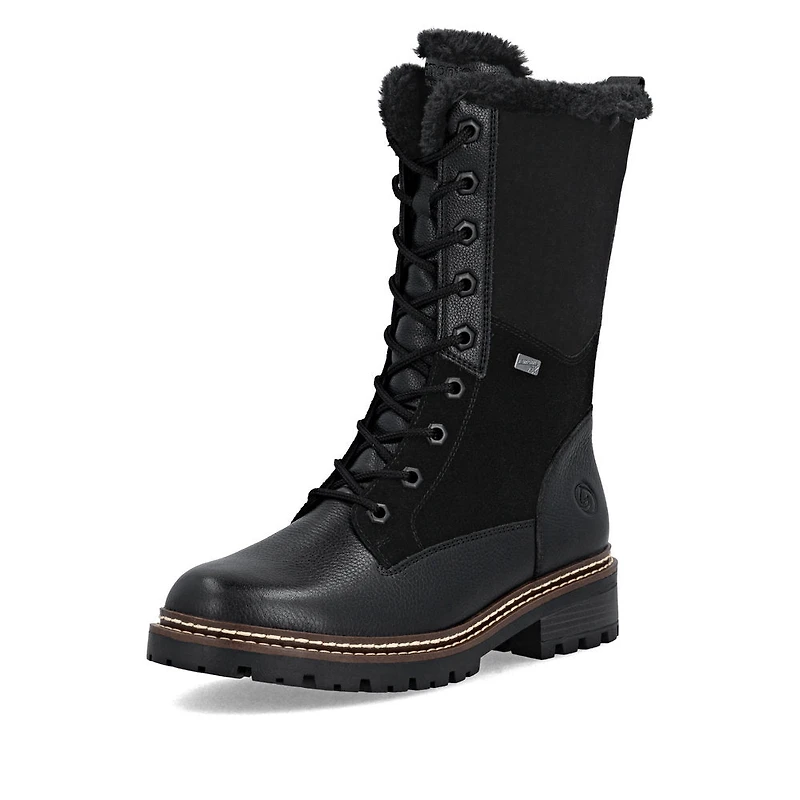 Stylish and extremely comfortable! These remonte high boots made of smooth leather in black will keep you safe in icy temperatures. In addition to the lacing, this model is equipped with a zipper that provides optimal support. The furry shaft edge harmoniously rounds off the look of the shoe. With the grippy and cushioning sole, sure-footed walking is a matter of course. The comfort width gives the toes more freedom of movement. The water-repellent upper protects against wetness, the thermal insole keeps the inside of the shoe warm and the Glass-Fibre technology provides extra grip. Cozy and very warm virgin wool keeps the feet warm all day long. Jackpot!