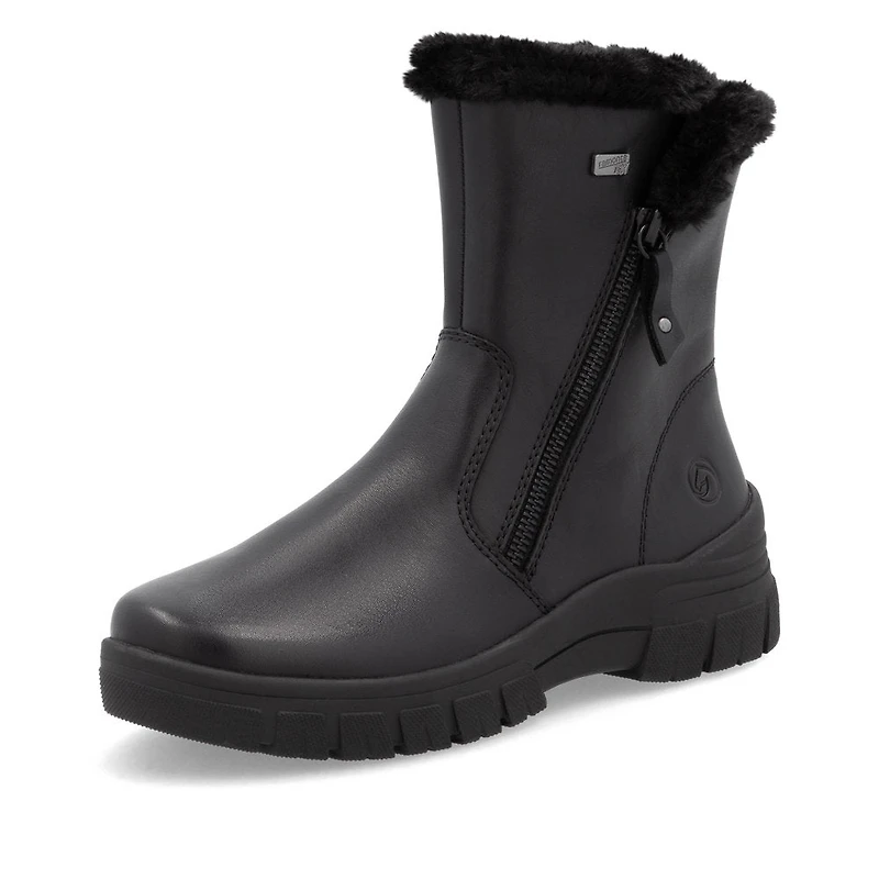 Cold feet don't stand a chance! These night black remonte ankle boots made of smooth leather will accompany you through the season with style and best comfort. The zipper makes it easy to put on and take off the shoe. With the light and grippy sole, sure-footed walking is a matter of course. The shoe is available in oversizes and is cut in comfort width so that the feet are not constricted at all. The water-repellent surface of the shoes offers optimal weather protection and the thermal insole features protection against the cold. Cozy and very warm virgin wool keeps the feet warm all day long. We love it!