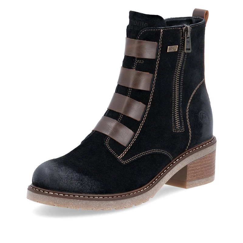 Style and comfort - the perfect duo! These comfortable urban black remonte ankle boots made of suede leather impress with a cool look and functional power. The zipper allows for the shoe to be put on very quickly. Stylish eye-catchers are the straps on the front side of the shaft. A grippy and flexible sole with block heel and the padded and removable insole are further arguments for this model. For large feet, the shoe is available up to size 45. Thanks to the remonteTEX technology, the shoe is water-repellent and offers protection from the wind. We love it!
