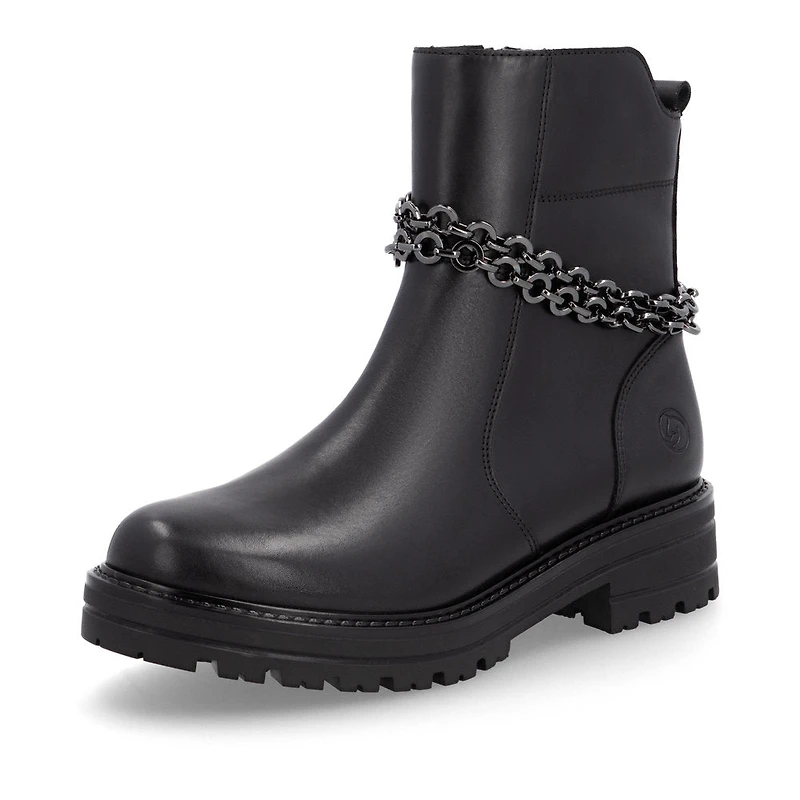 The full load of style vibes! The night black remonte ankle boots made of smooth leather are an absolute must-have in every shoe cupboard. A zipper allows for a quick and easy entry. The removable stylish chain around the shaft is a real eye-catcher. The design is complemented by the removable insole together with a grippy and flexible sole with block heel. The ankle boots in comfort width are also available up to shoe size 45! You can't get more style than this!
