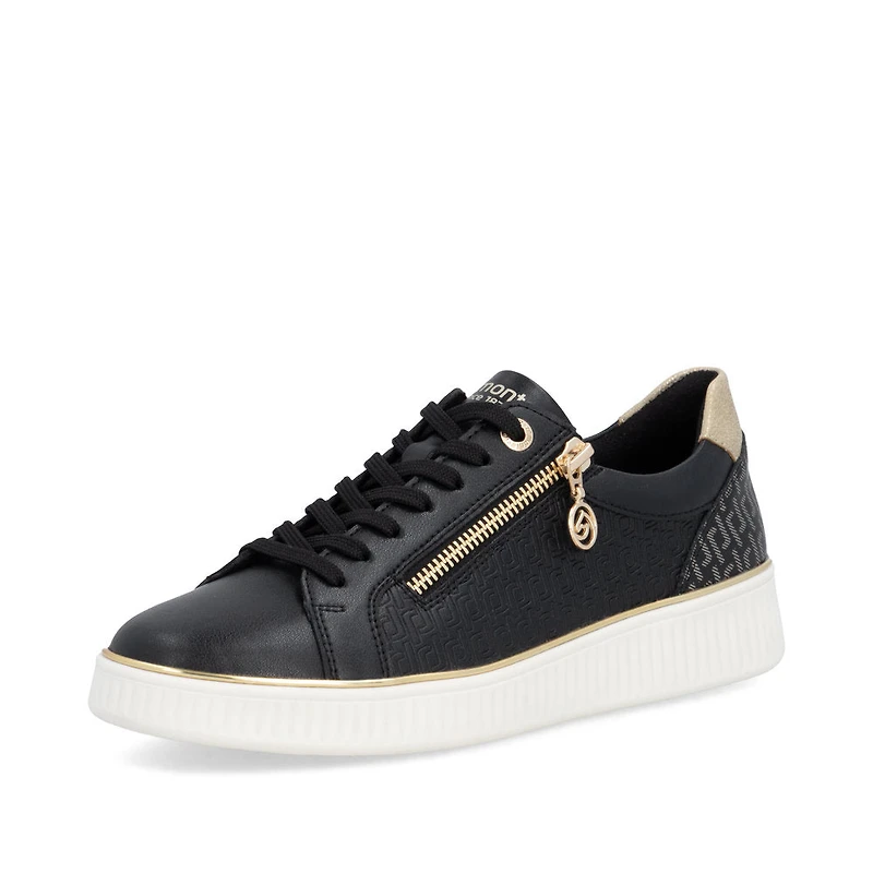 Walk more lightly, live easier! This black remonte low-top sneaker made of smooth leather combines lightness, comfort and style. Perfect for everyday wear. The clever combination of lacing and zipper provides optimal support and makes the shoe easy to put on and take off. Thanks to the proven remonte Lite 'n Soft technology and the padded and removable insole, these sneakers are featherlight and comfortable to wear. These sneakers in comfort width are also available up to shoe size 45! The microvelour lining is light and breathable. Jackpot!