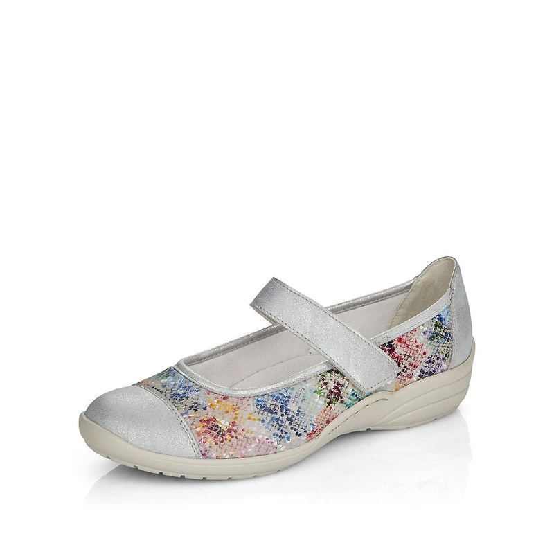Cool style with maximum comfort? Here it is! You'll be cool and casual, yet stylish, with these multi-colored remonte ballerinas. The ballerinas are put on in no time thanks to a hook and loop fastener. The multi-colored print effectively freshens up the design. The functional highlights are rounded off by the padded exchangeable leather footbed and the light and cushioning sole! Furthermore, the extra width H offers your feet more freedom of movement in the forefoot area. Your summer style!