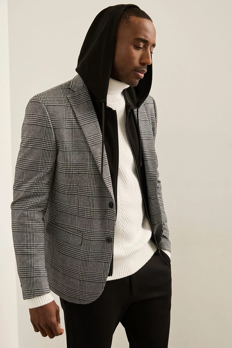 This tailored check jacket blends structure and versatility with a removable hooded insert. Crafted in a soft stretch fabric with a refined plaid pattern, it’s designed to adapt: polished with the hood off, modern with it on. Finished with sharp lapels and clean lines for a look that’s effortless and elevated.