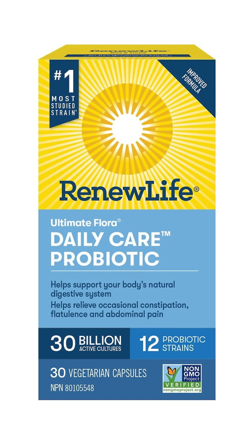 Feel your best every day with 30 billion live cultures from 12 probiotic strains that help promote digestive health—all in just one Renew Life® Ultimate Flora® Daily Care™ Probiotic vegetarian capsule.