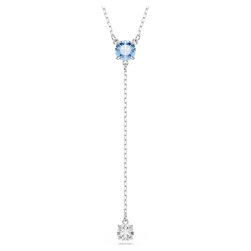 Shaped with simplicity and infused with colour, this necklace is a pure expression of Swarovski’s joyful style. The rhodium plated design features a central round-cut crystal in blue, with a clear Swarovski Zirconia that is suspended below from a delicate chain. Wear this light-catching piece to illuminate your look for any special occasion.