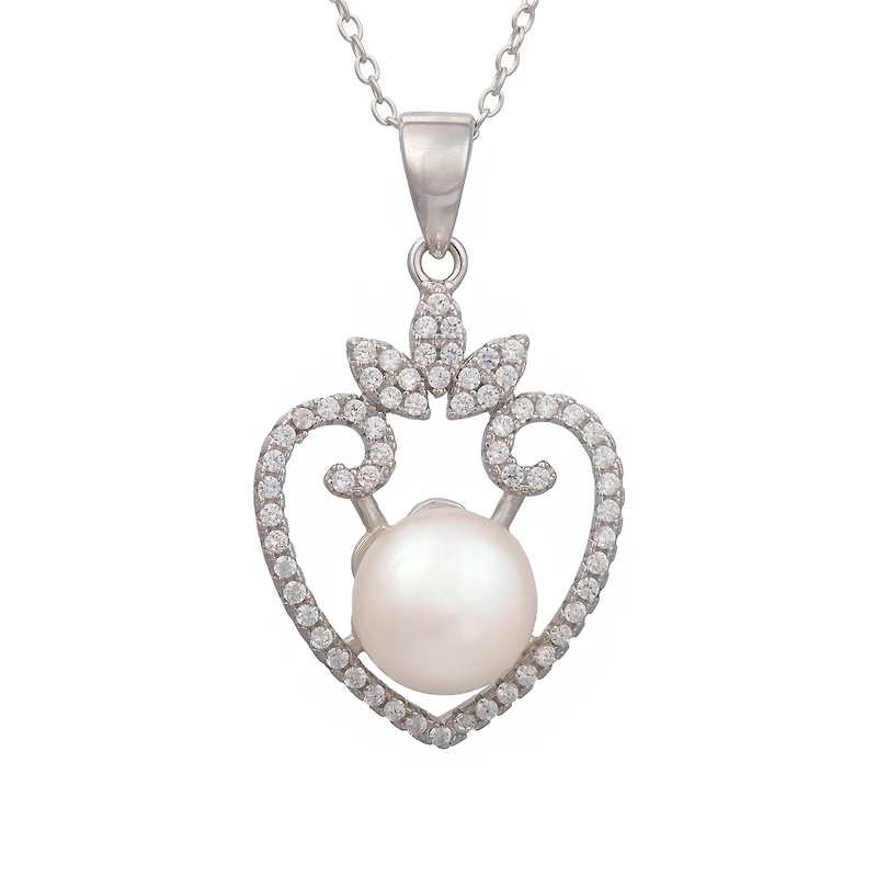 Rhodium Plated Sterling Silver Heart Pendant with Pearl, Cubic Zirconia and Chain - 16