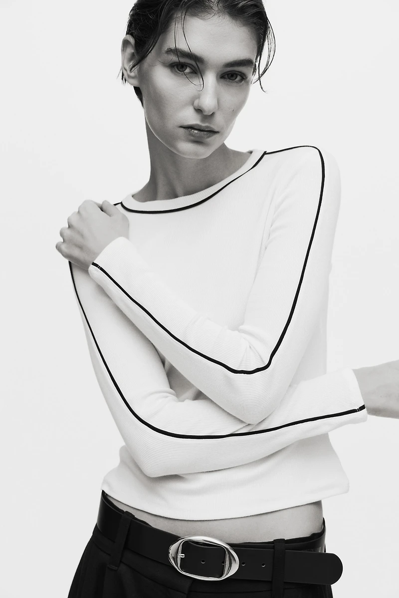 Top in ribbed cotton jersey with accent-color piping. Ribbed round neckline, long sleeves, and a straight-cut hem.