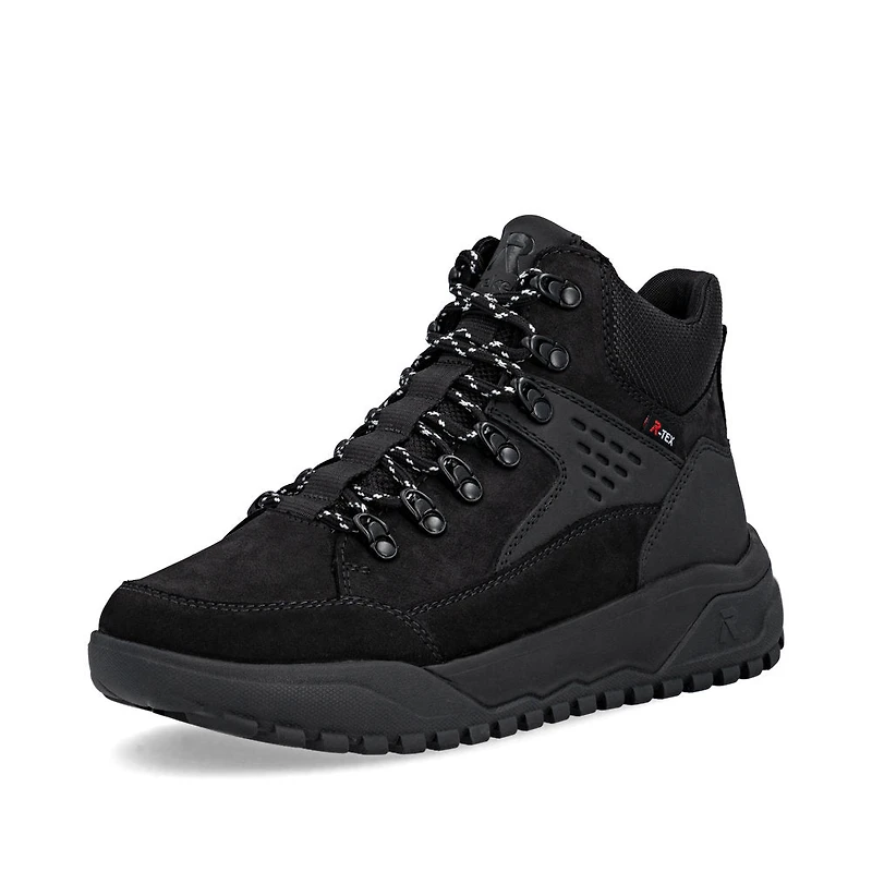 Stylish and comfortable through the cold season! These black Rieker lace-up boots made of suede leather are a comfortable companion. The lacing complements the zipper for functionality and comfort. The striking eyelets are pretty details. The flexible and very light sole additionally pampers the feet at every step. The comfort width gives you more space in the shoe. Thanks to the water-repellent properties of the upper material, best weather protection is provided. The thermal insole keeps the inside of the shoe warm and the Fiber-Grip sole offers additional grip. Cozy and very warm virgin wool makes these boots the perfect companions no matter when, no matter where! Pure wearing luxury!
