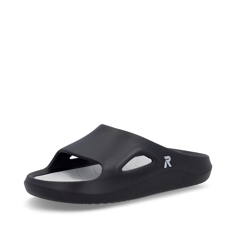 These black Rieker mules are made of quality synthetic material. There is no need to press a fastener to put the shoe on or take it off. The EVA outsole is flexible and ultra light. The insole is extra soft. The comfort width means the shoe fits perfectly.