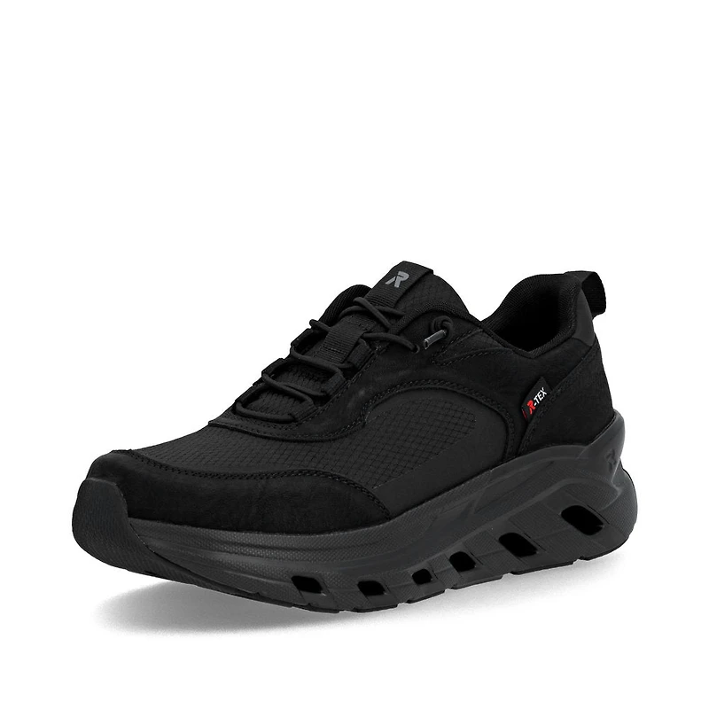 Rieker shoes in black made of quality synthetic leather. Walk Protected: the model is equipped with a water-repellent, breathable RiekerTEX membrane. Walk Dry: the model is equipped with a water and dirt-repellent HighTech Nano coating. Padded, removable MemoCup insole with rebound effect for dynamic rolling from heel to toe. Light Drysport lining with breathable properties. Includes an additional pair of laces for replacement.