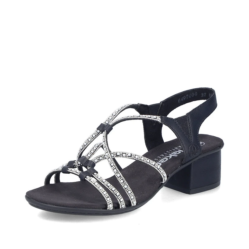 Up for anything fun! These vegan black Rieker strap sandals are perfect for everyday wear. Thanks to the stitched construction, the shoe is particularly stable and offers a flexible sole that adapts harmoniously to the foot. The elastic band makes the shoe especially easy to put on and take off. The rhinestones are real eye-catchers. With the light and shock-absorbing sole with block heel, your feet will be cushioned at every step. All in all, the perfect blend of style and comfort!
