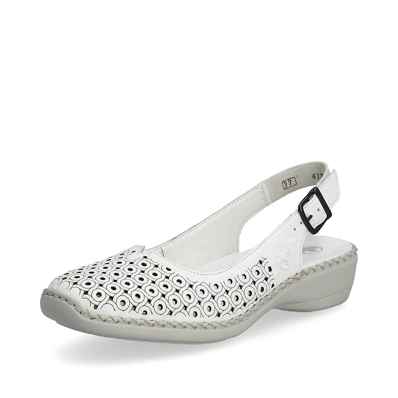 All in one shoe! You won't want to take off these white Rieker slingback pumps made of smooth leather. The stitchdown construction makes the shoe robust and the sole particularly flexible without causing damage at the transition to the upper. The pumps are closed with a trendy buckle. The shock-absorbing and light sole with wedge heel offers lasting comfort - even on long days. Another plus is the extra soft cover sole. Moreover, the narrow E fit provides extra support. Fashionable wellness feeling in Rieker style!