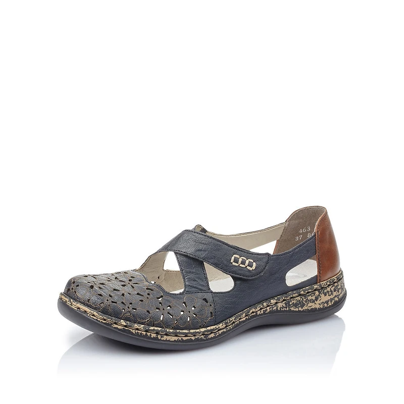 Style and comfort - forever inseparable! You can look forward to the beautiful weather even more with these Rieker ballerinas made of smooth leather in blue! The stitchdown construction makes the shoe robust and the sole particularly flexible without causing damage at the transition to the upper. A hook and loop fastener allows for a quick and easy entry. The shock-absorbing and light sole with wedge heel ensures a pleasant wearing sensation. The cover sole is also extra soft. Fashionable well-being in the style of Rieker!