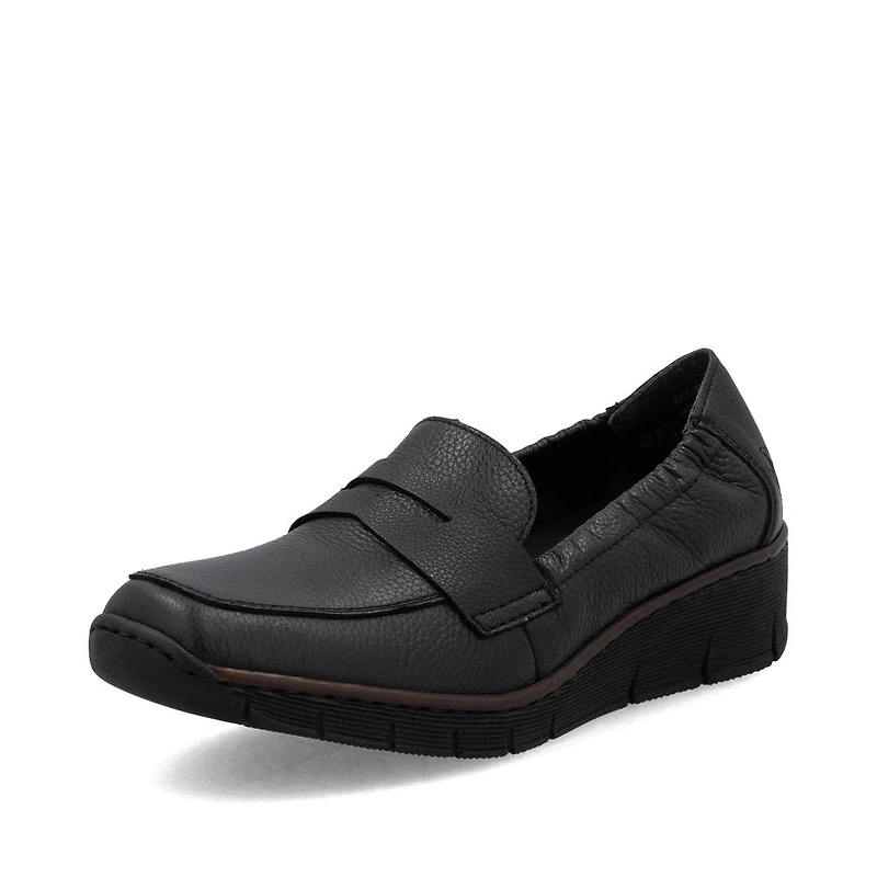 All-time favourite! These black Rieker loafers made of smooth leather impress with a classic design and high comfort. This shoe was made using the traditional stitchdown technique, which gives it a high degree of robustness and flexibility. Putting on the shoe is facilitated by an elastic band. The light and shock-absorbing sole with wedge heel ensures a pleasant wearing sensation. In addition, the extra soft cover sole provides an extra portion of comfort. Extra support is provided by the slim fit. You can't ask for more!