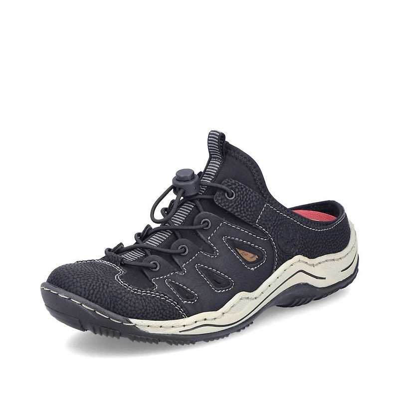 Comfort meets style. These black Rieker clogs are a comfortable companion. Thanks to the stitchdown construction, this shoe is particularly durable and flexible. The entry is facilitated by an elastic band. With the shock-absorbing and light sole, your feet will be pampered at every step. Fashionable well-being in the style of Rieker!