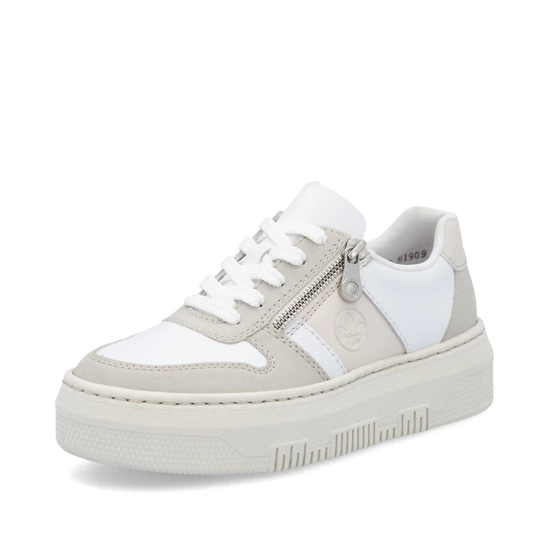 Sporty and modern. These white-beige Rieker low-top sneakers have it all: comfort, function and, of course, style. The traditional stitchdown construction makes the shoe particularly flexible and robust and ensures a great fit. In addition to the lacing, this model is equipped with a zipper that provides optimal support. The flexible and ultra light platform sole ensures a pleasant walking sensation even when worn for a long time, and the extra soft cover sole is another plus. So let's get going!