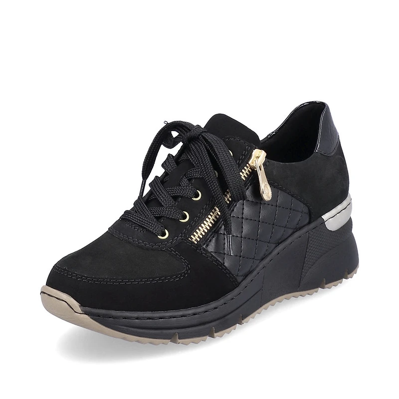 Now it's getting sporty. You'll be cool and casual on the move in these jet black Rieker low-top sneakers. Made with the stitchdown construction, the model is robust, flexible and offers a perfect fit. In addition to the lacing, this model is equipped with a zipper that provides optimal support. The quilted look on the side effectively freshens up the design. With the shock-absorbing and light sole with wedge heel, your feet will be pampered at every step. The removable insole is a cool feature that provides practical comfort. The model is cut in comfort width G. Pure wearing luxury!
