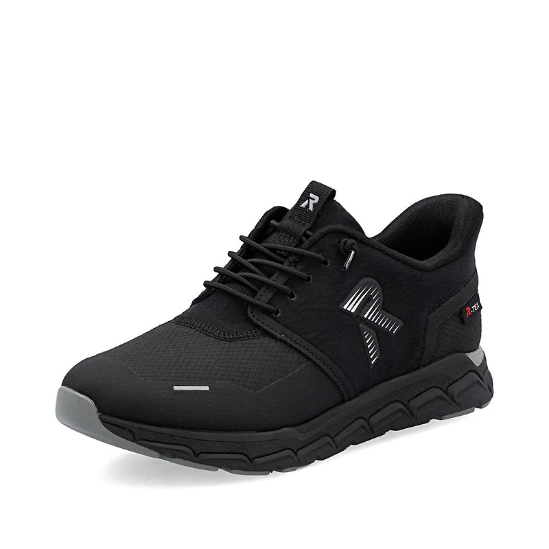 Rieker low-top sneakers in black made of quality textile. Walk Protected: the model is equipped with a water-repellent, breathable RiekerTEX membrane. Ready2GO: slip on without using your hands - robust model thanks to stiff heel section. Super quick and easy to fasten thanks to the elastic band. Removable MemoCup insole with padding for a rebound effect. Perfect fit thanks to the comfort width. Also included: an additional pair of laces.