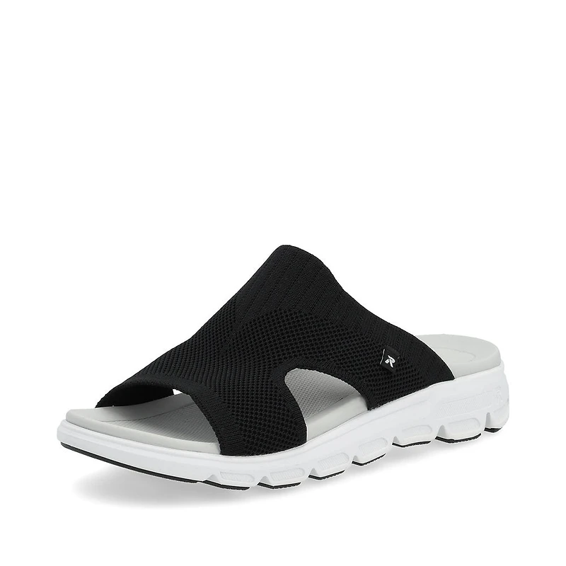 Black Rieker mules made from quality textile. Walk Clean with the Machine Washable feature - the model can be cleaned in the washing machine. The elastic band makes the shoe super quick and easy to put on. EVA/rubber outsole with super light and flexible properties. The insole is extra soft. The slim fit ensures good support in the shoe.