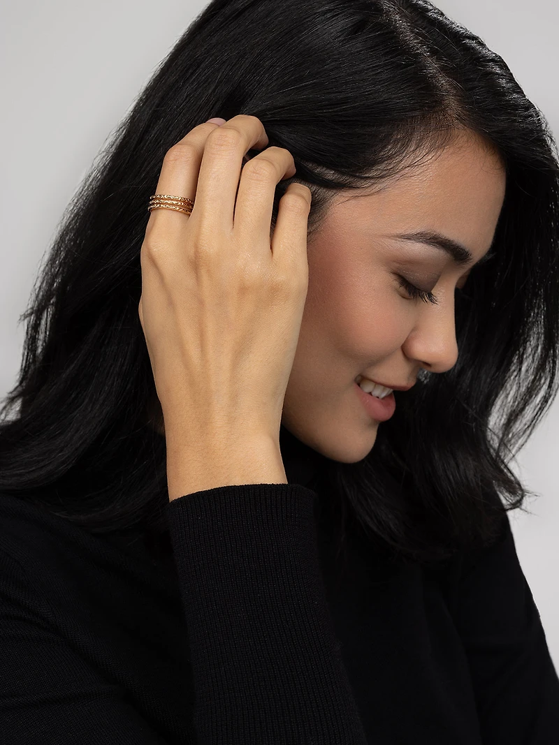 Gold-tone ring composed of three stacked bands, each featuring a slightly textured surface.