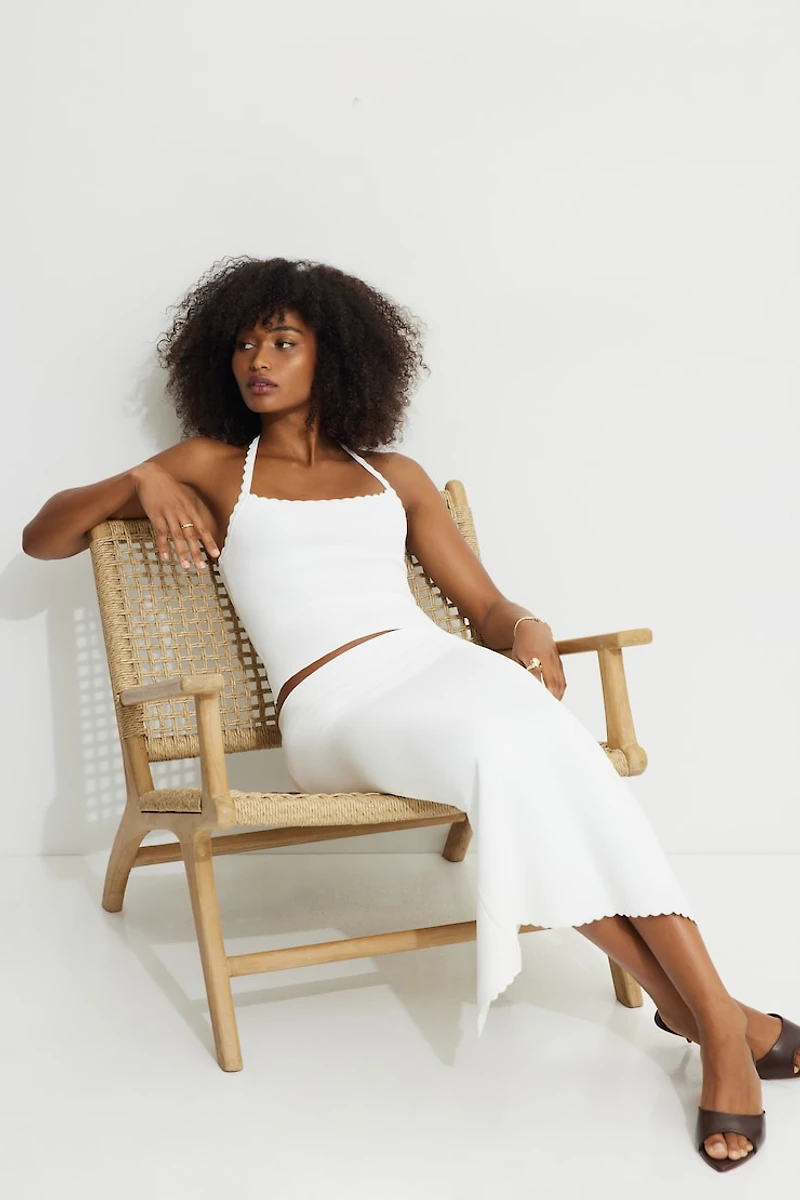 This maxi skirt is made from soft and heavyweight yarn, designed for a fitted silhouette. Style it with a