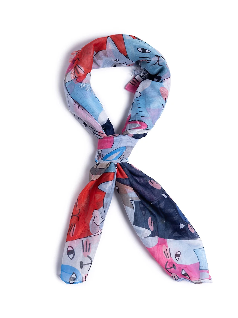 Rectangular scarf made of lightweight, semi-transparent woven fabric. It features a multicolored printed pattern depicting stylized cats.