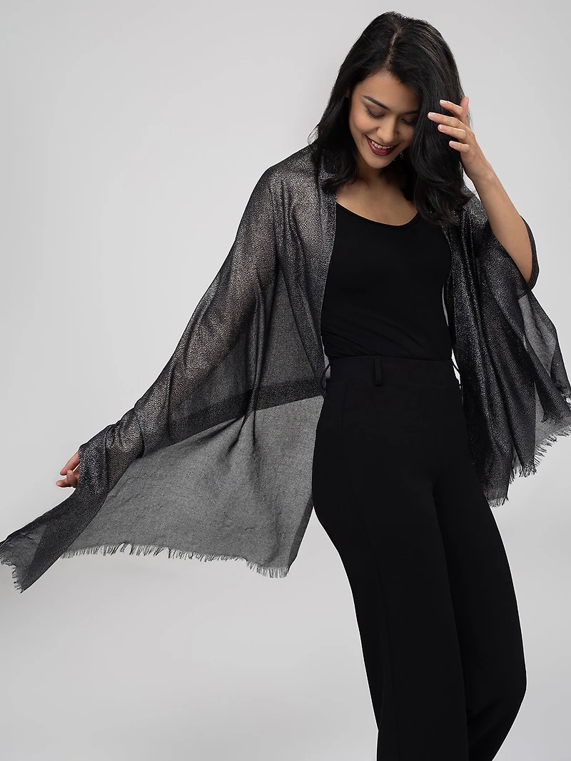 Poncho crafted from a lightweight fabric with a shimmering finish. Its fluid silhouette is accentuated by fringed edges.