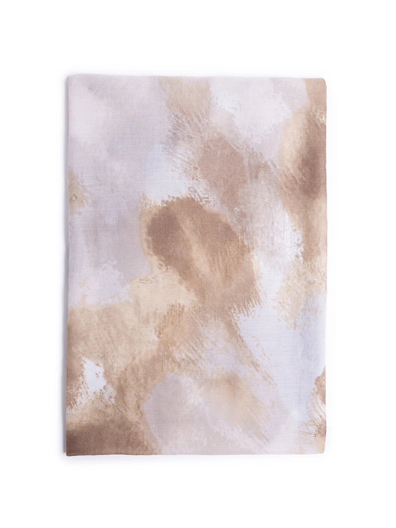 Rectangular scarf made of thin woven fabric, featuring an abstract printed pattern in beige and off-white tones distributed across the surface.