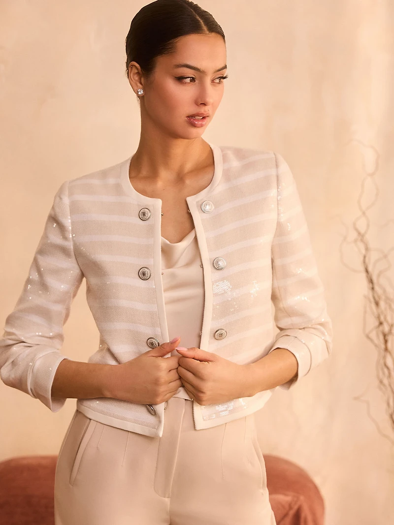 Add a subtle shimmer to your look with this sequined striped jacket, designed with clear sequins for a refined, light-catching finish. The structured silhouette is elevated by tonal stripe detailing and delicate embellishment that catches the light without overwhelming the look. Finished with a classic button front and tailored fit, this jacket transitions seamlessly from day to evening, pairing effortlessly with dresses, trousers, or denim. Wear it on your next date night, girls' night out, or a daytime outing to add some unexpected glamour to your style. Woven sequin & yarn-dyed striped fabric Crew neck 3/4 sleeves Clear sequins Striped design Non-functional buttons Hook & eye closure Fully lined Model is wearing size XS Fabric: 100% polyester Lining: 100% polyester Dry clean only