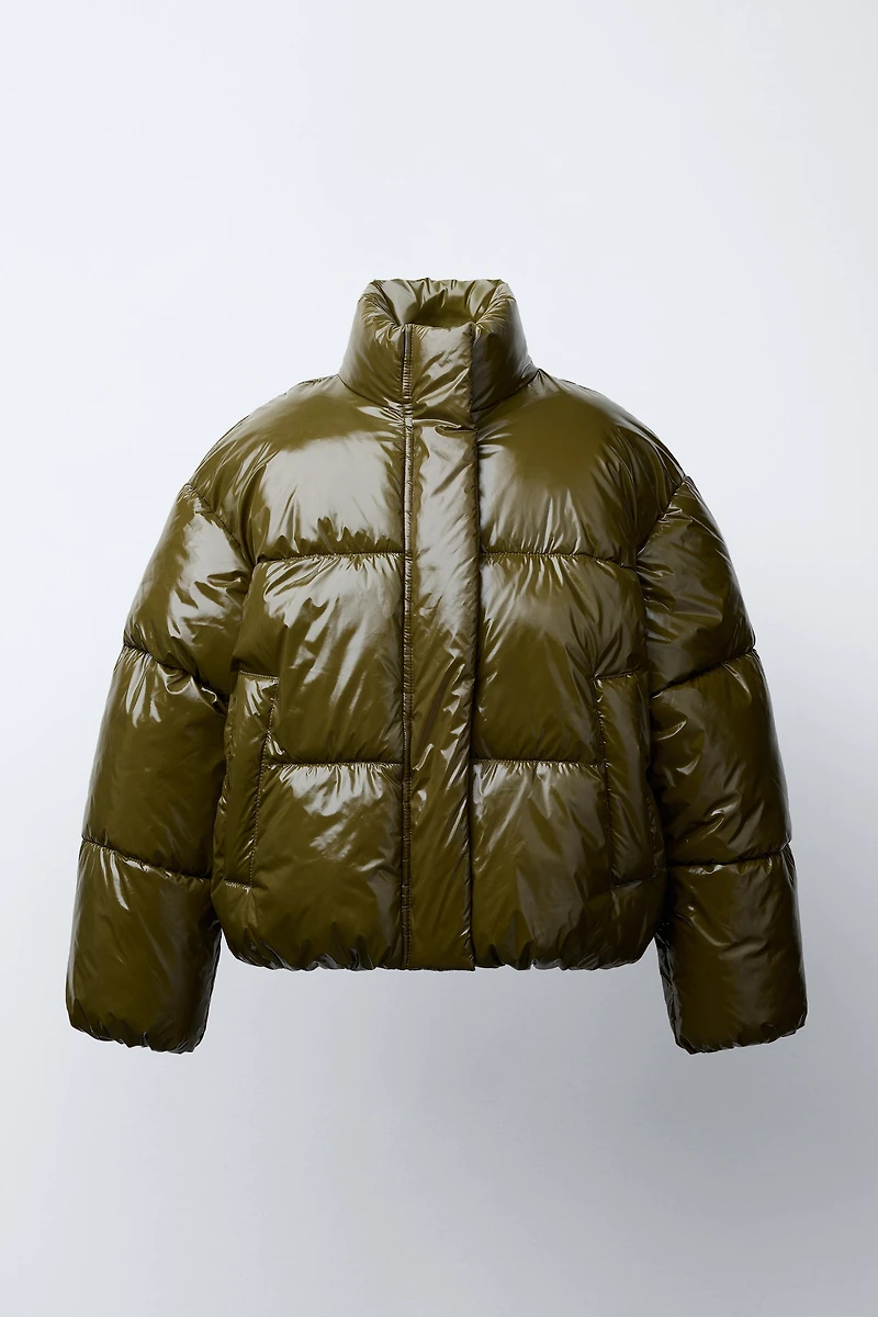 Puffer jacket with high collar and long sleeves with elastic cuffs. Front zip closure hidden by a placket with snap buttons. Front pockets with piping detail. Elastic hem.