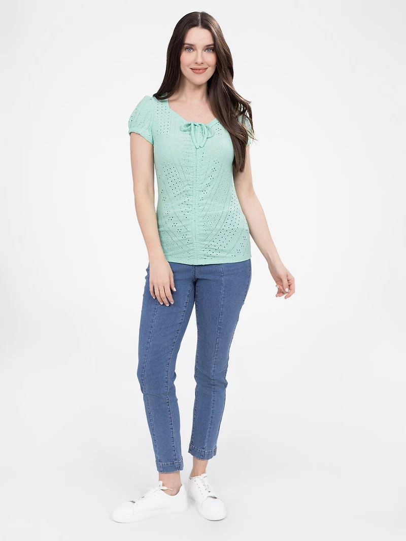 Embroidered openwork top, featuring a central gathering with a refined bow at the neckline. The puff sleeves add a touch of softness to the look.