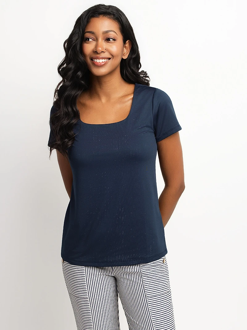 Solid semi-fitted t-shirt with a wide rounded neckline and short sleeves.